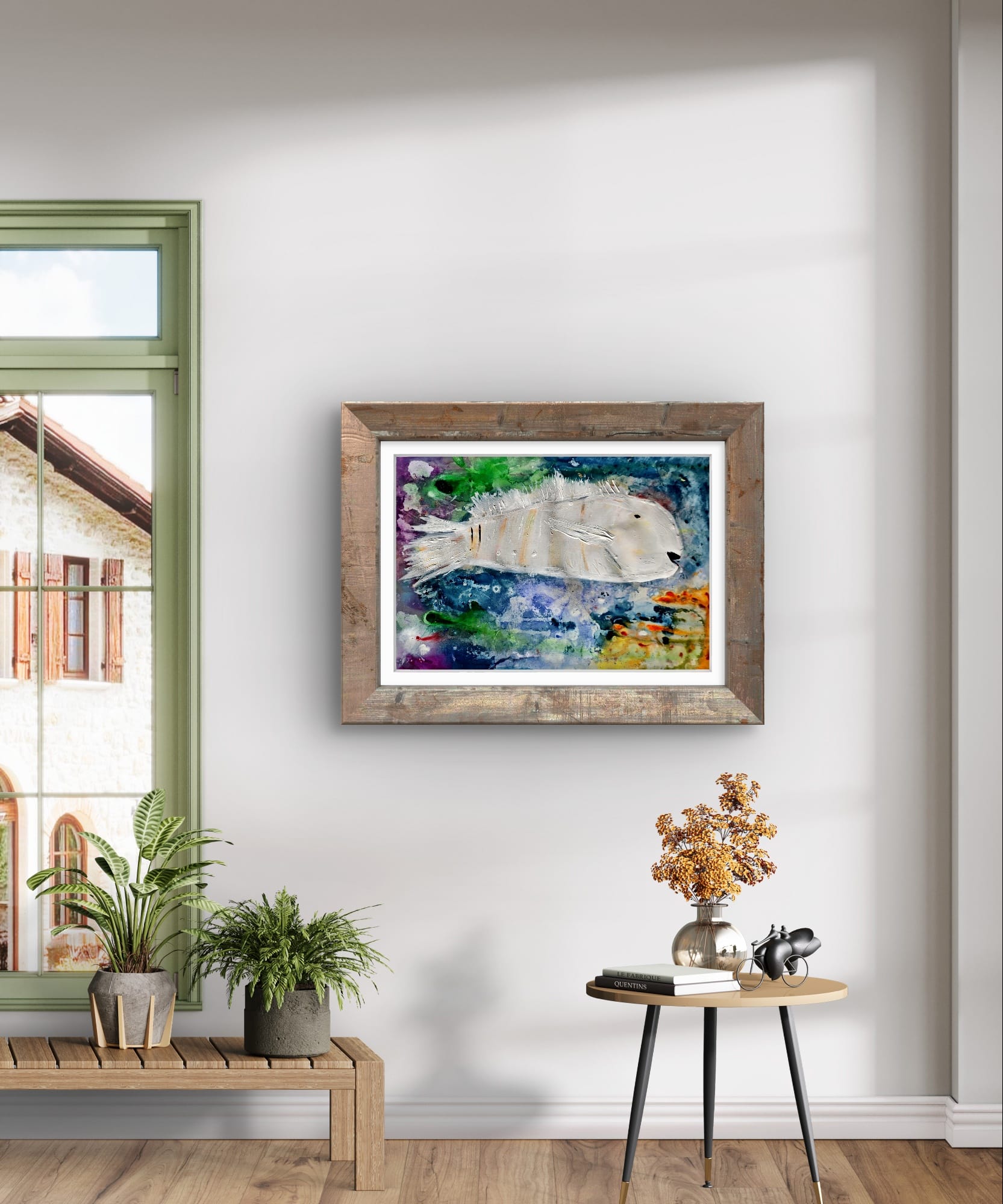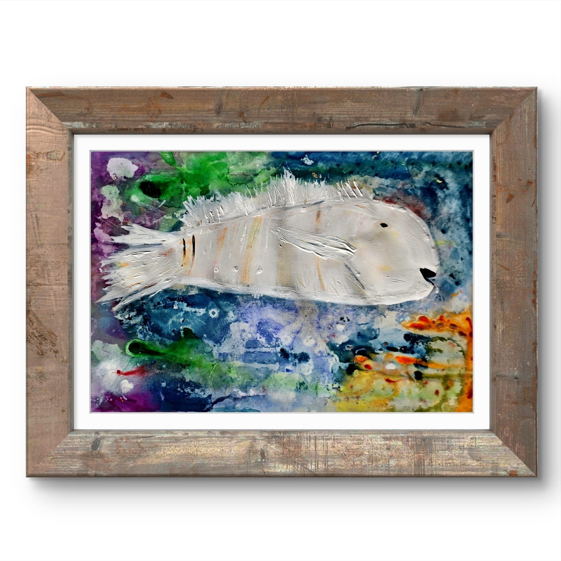 Una figura marina emerge en blanco luminoso sobre un fondo líquido de azules, verdes y violetas, con destellos cálidos que sugieren coral. El pez, modelado con relieve y gestos amplios de espátula, transmite calma y presencia: un encuentro directo, a la altura de los ojos, en pleno mar. El color se expande como agua en movimiento, mientras la textura blanca concentra la luz y guía la mirada.