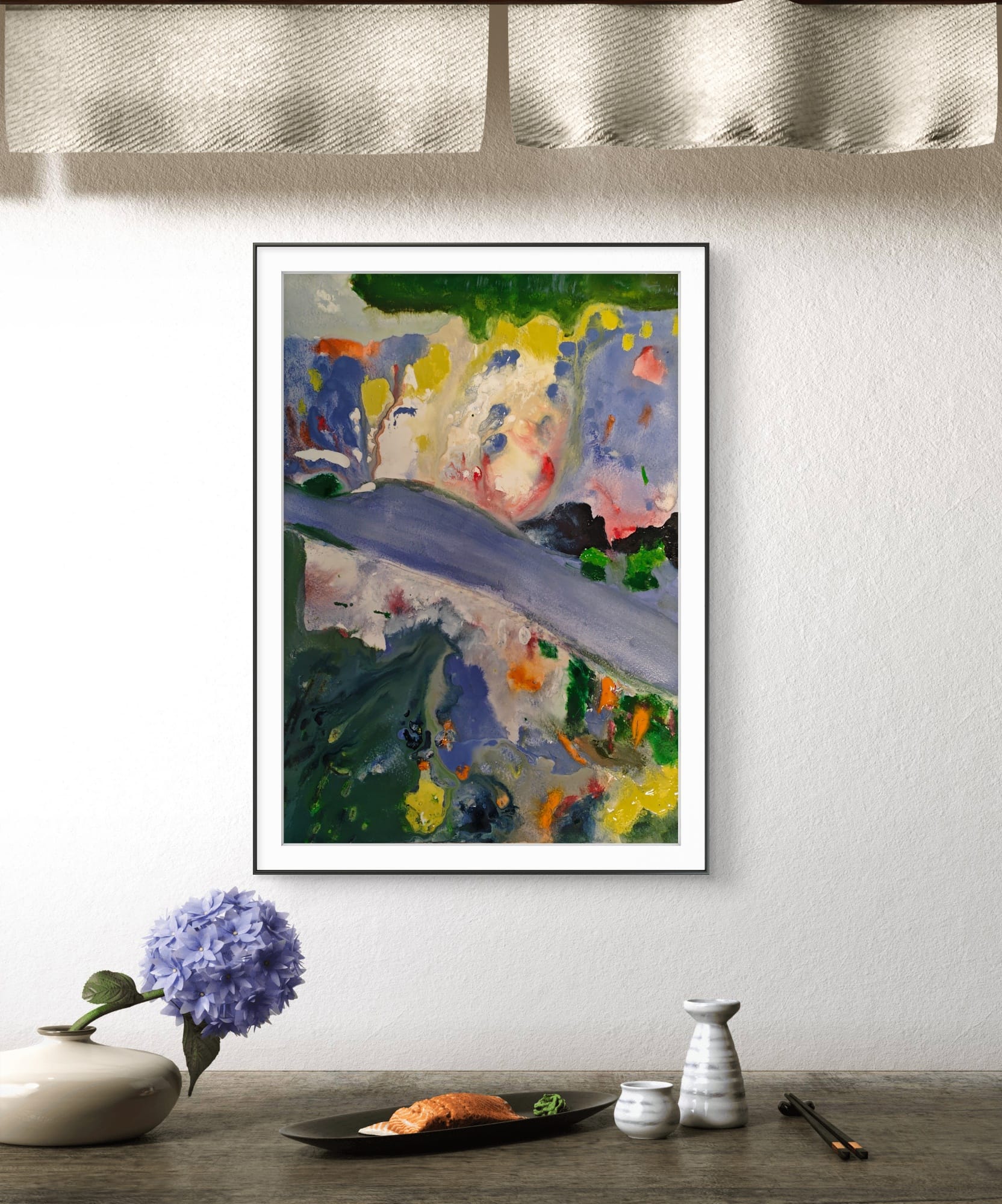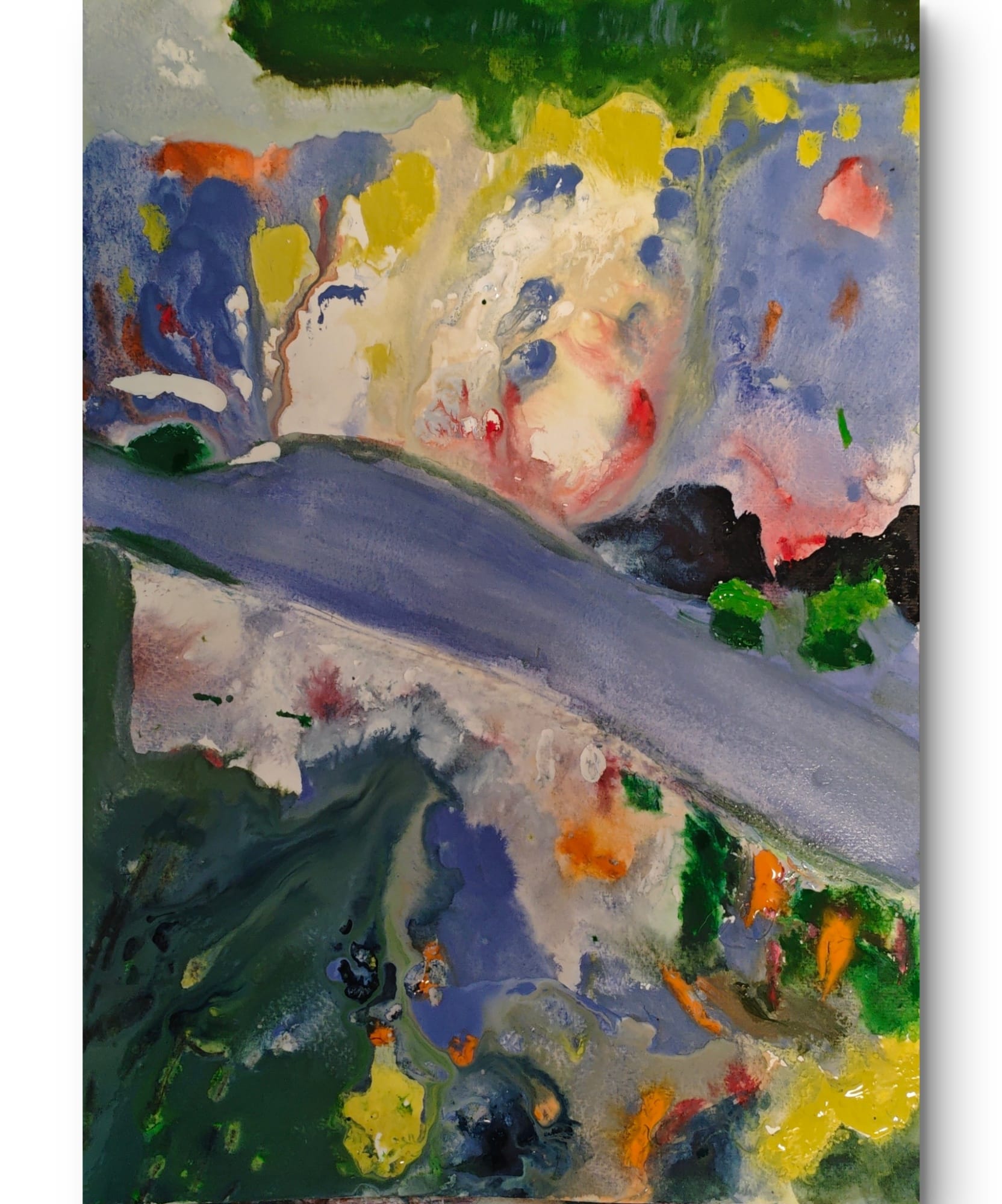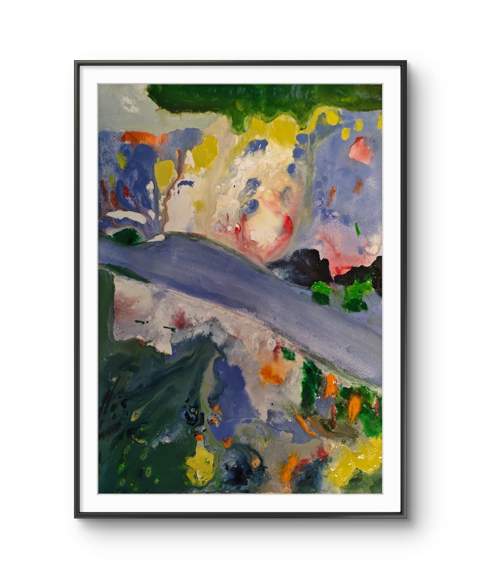 Una corriente violeta cruza el plano como si fuera una lengua de mar que separa dos orillas. A su alrededor, el vertido de agua deja que el pigmento respire: verdes profundos, amarillos salinos y notas coral que recuerdan la espuma y la roca mojada. La materia fluye y se detiene en bordes suaves, como una rompiente vista a ras del agua.